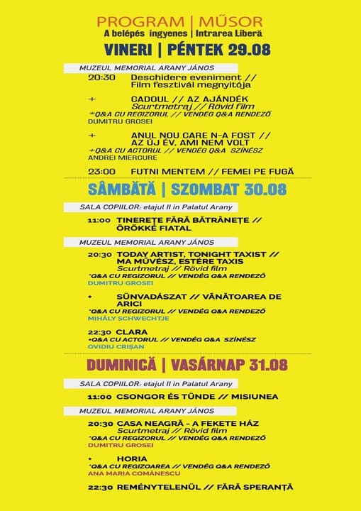- Duminică, 31 august, ora 20:30: Festivalul se încheie cu o notă de aventură și auto-descoperire, cu filmul românesc „Horia”, regizat de Ana Maria Comănescu. Acest film este o poveste de căutare a identității și trecere la maturitate, care urmărește aventura unui adolescent îndrăgostit care pleacă de acasă pe vechea motoretă a tatălui său, fiind forțat să călătorească alături de o fată isteață cu care formează o pereche neașteptată. După proiecție, regizoarea Ana Maria Comănescu va fi prezentă pentru a răspunde întrebărilor publicului, oferind perspective inedite asupra creației filmului.