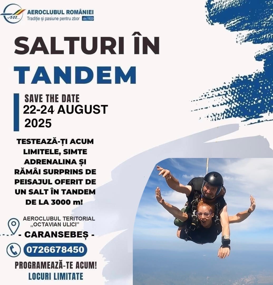 Pentru cei care visează să privească lumea de la înălțime și să simtă adrenalina zborului liber, Aeroclubul Teritorial ”Octavian Ulici” Caransebeș readuce o oportunitate de neuitat. În perioada 22-24 august 2025, entuziaștii vor putea experimenta salturi în tandem cu parașuta, sub îndrumarea instructorilor experimentați ai clubului.