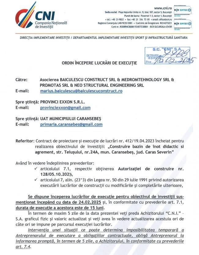 Compania Națională de Investiții (CNI) a aprobat începerea lucrărilor la obiectivul de investiții „Construire de bazin înot didactic și de agrement, str. Teiușului, nr. 24A, mun. Caransebeș, jud. Caraș-Severin”. Lucrările vor începe oficial pe 24 februarie 2025.