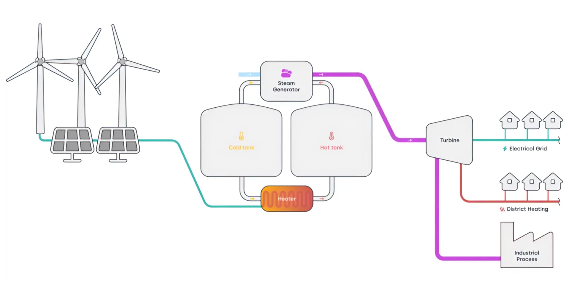 - Stocarea energiei: Surplusul de energie electrică generat de surse regenerabile (eoliană sau solară) este convertit în căldură, care încălzește saretopită. Aceasta este păstrată într-un sistem cu două rezervoare: unul pentru sare fierbinte, altul pentru sare răcită.