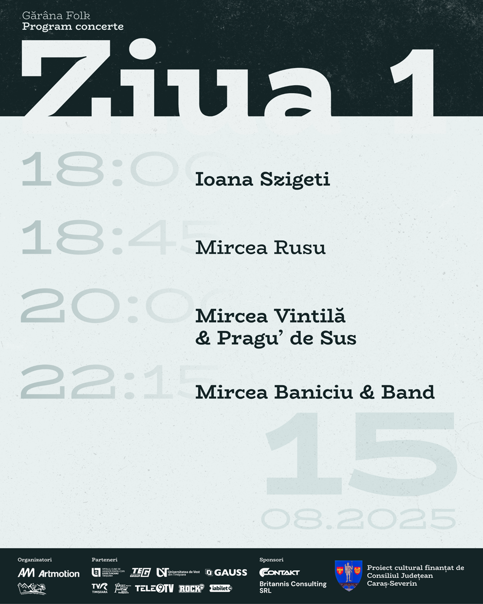 Dragi cititori, vă invităm cu bucurie la cea de-a 18-a ediție a Gărâna Folk – festivalul emblematic ce transformă Poiana Lupului într-un refugiu de muzică autentică, natură sublimă și solidaritate. Între 15-17 august, ascultați legende ale folk-ului românesc precum Mircea Baniciu, Mircea Vintilă sau Ada Milea, descoperiți talente noi, bucurați-vă de ateliere și drumeții, sau priviți stelele alături de comunitatea folk. Fiecare bilet sprijină Spitalul „Louis Țurcanu” din Timișoara, iar studenții beneficiază de 35% reducere. Veniți să trăiți trei zile de basm în inima Banatului. „Pentru mine, Gărâna e cel mai bun loc de spectacol” (Mircea Baniciu). Vă așteptăm cu drag!