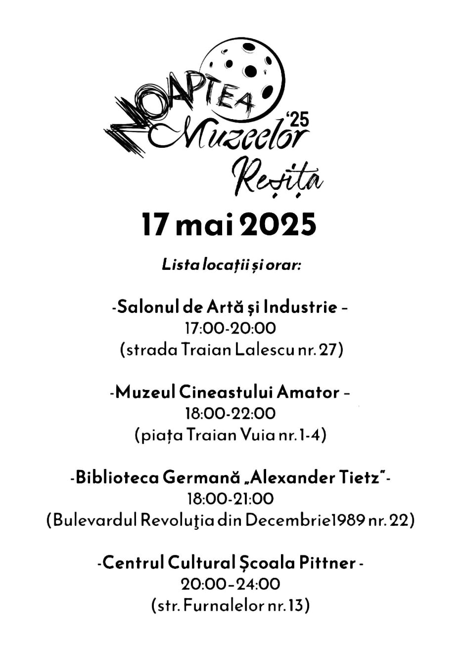O noapte ce țese legături între trecut și viitor Noaptea Muzeelor din Reșița nu este doar un eveniment cultural, ci o celebrare a identității locale, în care fiecare expoziție, spectacol sau colț de stradă devine o pagină vie a istoriei orașului. Prin colaborarea dintre instituții precum Teatrul de Vest, Muzeul Cineastului Amator sau Biblioteca Germană „Alexander Tietz”, Reșița demonstrează că cultura este un pilon al coeziunii comunitare. Iar tombola cu premii unice – de la tricouri create prin linogravură la plachete turnate din aluminiu – transformă participarea într-o aventură cu recompense memorabile. Până la miezul nopții, când Centrul Cultural Școala Pittner închide porțile, orașul rămâne un labirint de inspirație, unde fiecare pas povestește o nouă legendă. Vă invităm să vă pierdeți în el cu curiozitate și să vă lăsați învăluiți de magia unei nopți care transformă patrimoniul în experiență colectivă.