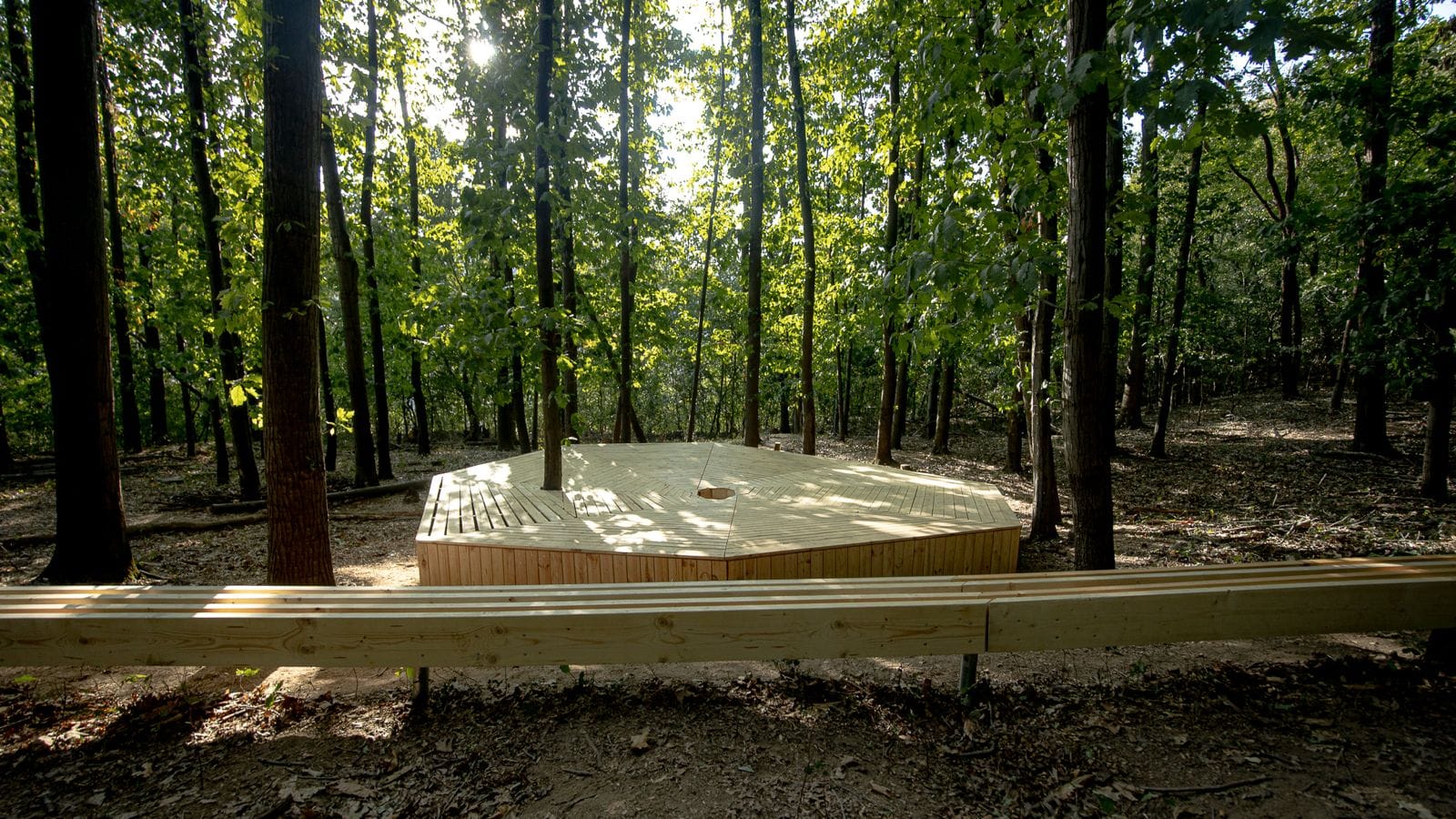 - O bancă lungă de 12 de metri, care servește atât ca loc de pauză pentru drumeți, cât și ca auditoriu în aer liber. Aceasta transformă spațiul într-un potențial loc pentru mici spectacole, lecții sau dezbateri comunitare.