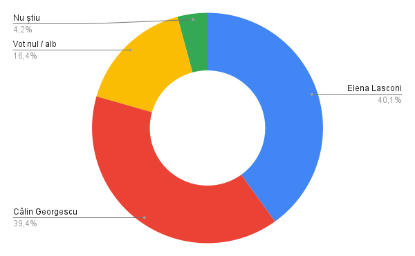 Potrivit sondajului, în primul tur, George Simion ar obține 30,4% din voturi, urmat de actualul primar general al Capitalei, Nicușor Dan, cu 26%, și de candidatul comun al PSD-PNL-UDMR, Crin Antonescu, care ar obține 17,9%. Victor Ponta, candidat independent, ar strânge 9%, în timp ce reprezentanta USR, Elena Lasconi, ar fi creditată cu doar 3,9%.