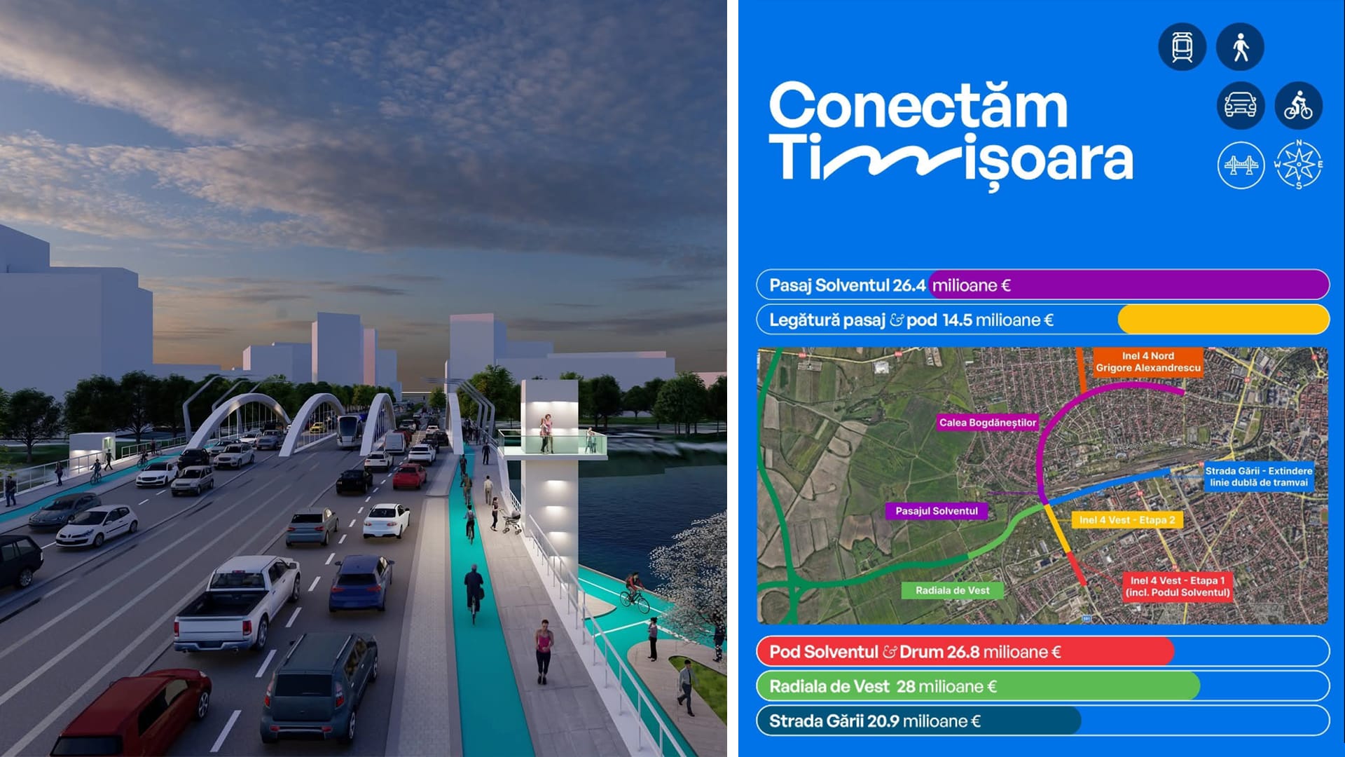 Un proiect emblematic pentru Timișoara: Podul de la Solventul, cu acces pentru tramvaie, mașini și bicicliști, a intrat în faza de licitație