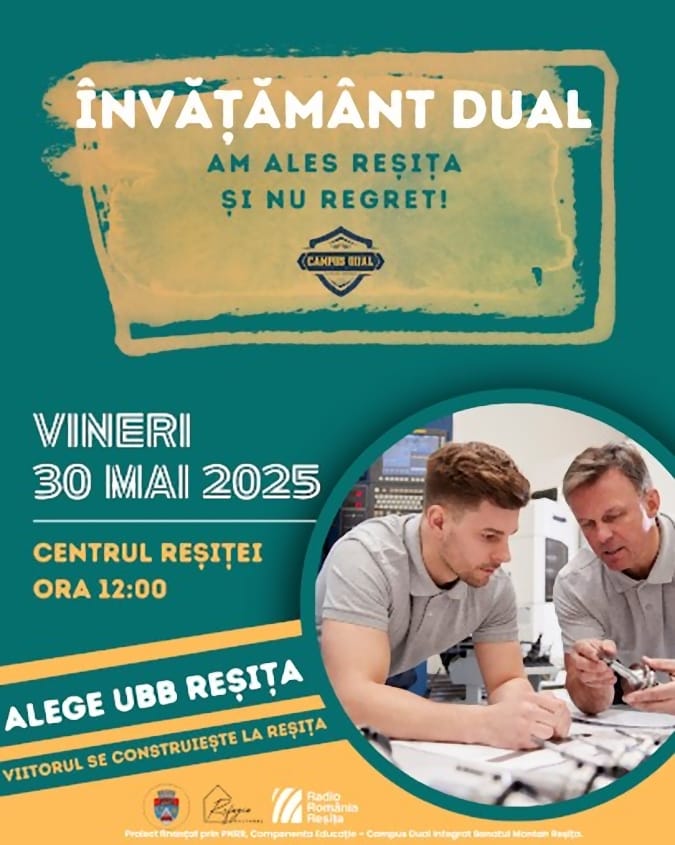 Nu rata șansa de a fi parte din acest eveniment transformator! Programul se desfășoară pe 30 mai, la Centrul Reșița. Participarea este gratuită, iar vizitatorii vor primi informații despre programele de învățământ dual, vor explora oferte de practică și vor putea aplica direct la oportunități relevante.
